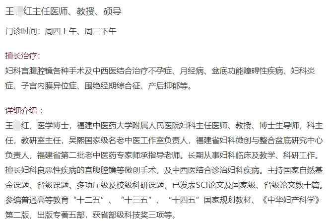 据医院官网信息,王某红是福建中医药大学附属人民医院妇科主任医师、教授、博士生导师。长期从事妇科临床及教学、科研工作。擅长妇科良恶性疾病的宫腹腔镜等微创手术,及中西医结合诊治妇科疾病。主持国家自然基金课题、省级课题、多项厅级及校级科研课题,已发表SCI论文及国家级、省级论文数十篇。参编普通高等教育“十二五”、“十三五”、“十四五”国家规划教材、《中华妇产科学》第二版,出版专著五部,获省部级科技奖三项等。