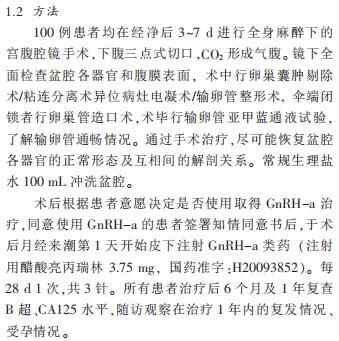 论文中还提及——100例患者均在经净后3~7d进行全身麻醉下的宫腹腔镜手术,下腹三点式切口,CO2形成气腹。术后根据患者意愿决定是否使用取得GnRH-a治疗,同意使用GnRH-a的患者签署知情同意书后,于术后月经来潮第1天开始皮下注射GnRH-a类药(注射用醋酸亮丙瑞林3.75mg,国药准字:H20093852)。每28d1次,共3针。所有患者治疗后6个月及1年复查B超、CA125水平,随访观察在治疗1年内的复发情况、受孕情况。
