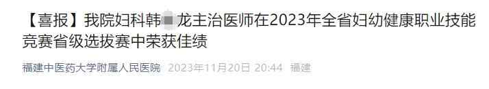 记者还查询发现,该医院官方微信公众号曾发布消息:韩某龙主治医师在2023年福建省妇幼健康技能竞赛省级选拔赛中,荣获宫颈癌防治项目组个人总分第三名。