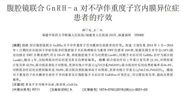 论文内文中提到,子宫内膜异位症(EMT)是指子宫内膜组织腺体和间质出现在子宫体以外部位而引起的一种病变,主要以疼痛和不孕为主要特征,不孕发生率高达40%~60%,是女性不孕症的重要原因之一。单纯的手术治疗并不能彻底清除病灶,术后复发率较高,因此术后应用促性腺激素释放激素激动剂(GnRHa)可以降低术后复发率,提高自然妊娠率。
