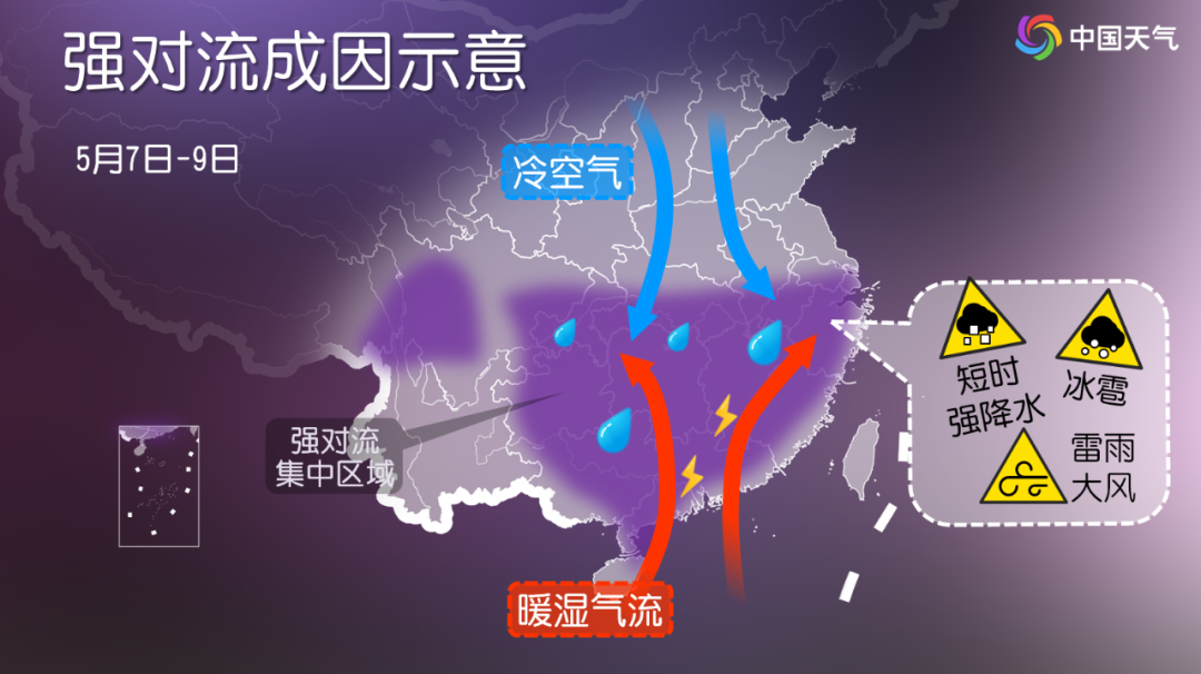 除了累计雨量大,这次强降水过程期间,由于冷暖气流交汇对峙,需要特别警惕伴随出现的强对流天气。