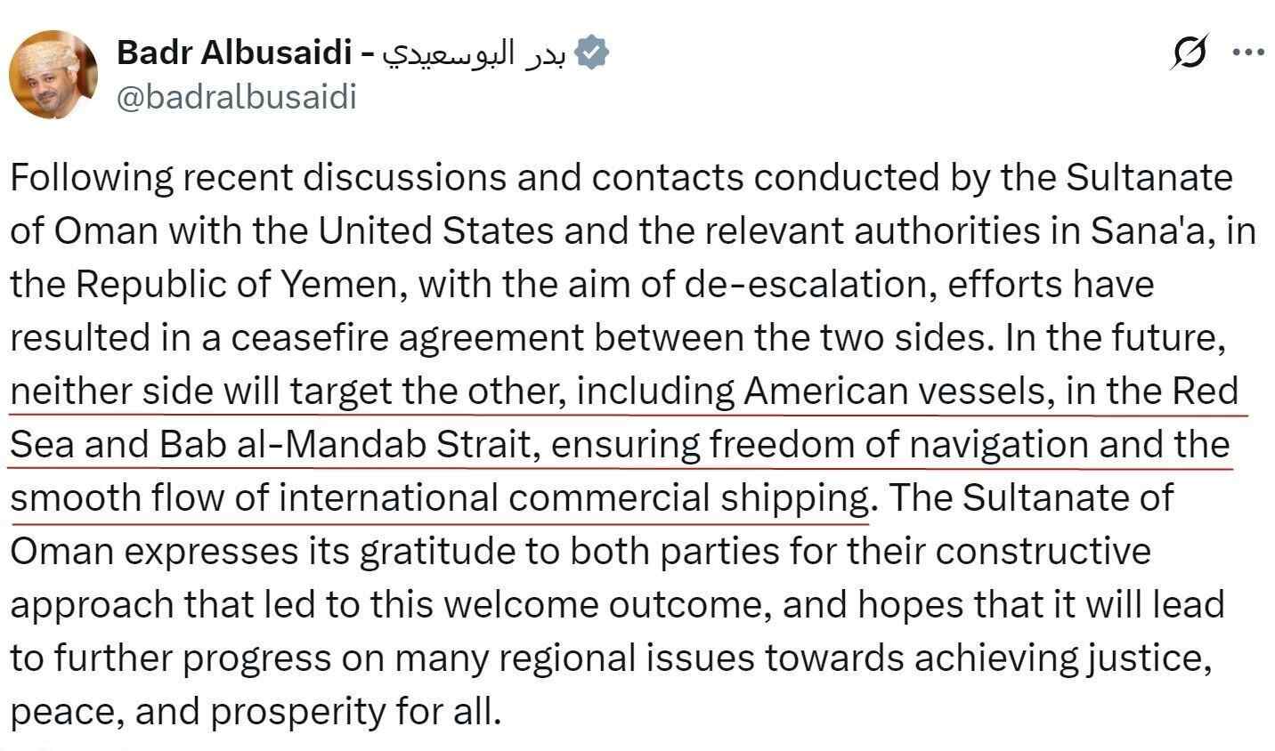当地时间6日,阿曼外交大臣巴德尔在社交媒体上发文说,美国与也门胡塞武装已达成停火协议。根据停火协议,未来双方将不再互相攻击,包括不得针对红海及曼德海峡的美国船只,以确保航行自由和国际商贸航运的顺畅。