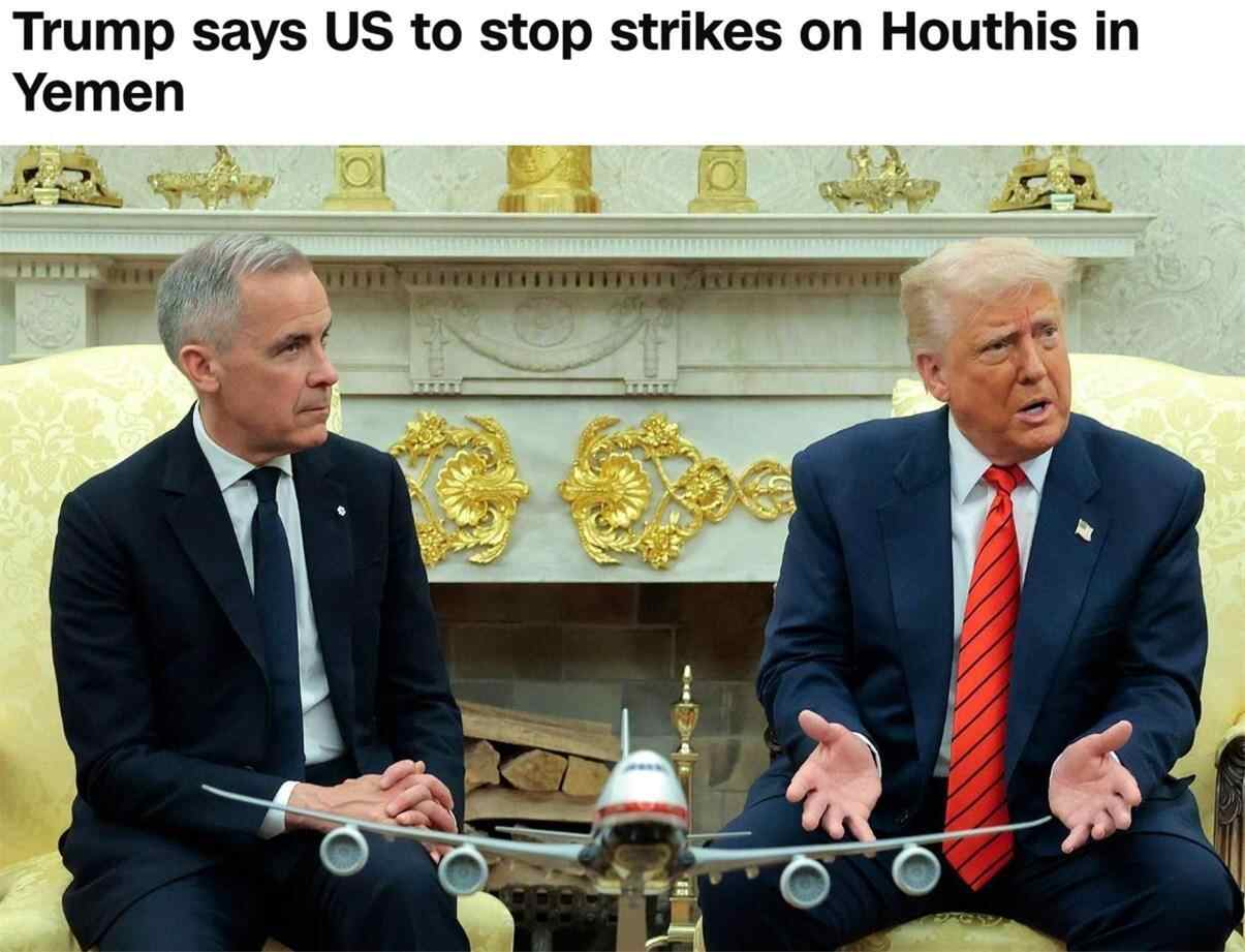 同一天,美国总统特朗普在白宫与到访的加拿大总理卡尼共同见记者时说,也门胡塞武装同意停止威胁中东水域航行安全,在此基础上,美国将停止对胡塞武装的轰炸。