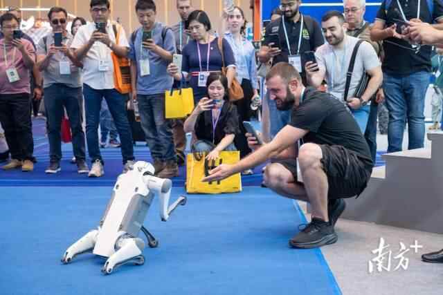 4月16日,第137届广交会吸引了大批外商,这是某机器狗生产与研发企业为观众展示该产品的功能,外商们纷纷围观拍照。南方+拍客 吴文军 摄