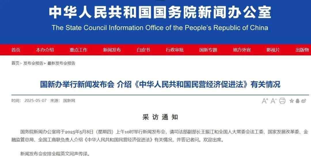 据国新网发布,国务院新闻办公室将于5月8日(星期四)上午10时举行新闻发布会,邀请司法部副部长王振江和全国人大常委会法工委、国家发展改革委、金融监管总局、全国工商联负责人介绍《中华人民共和国民营经济促进法》有关情况,并答记者问。