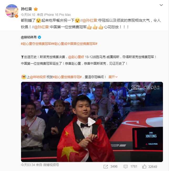 演员孙红雷则转发微博写道:“中国第一位世锦赛冠军!心花怒放!!!”随后,再次转发补充道:“夺冠后以及领奖的表现相当大气,令人钦佩!”“都别睡了,起来吃早餐庆祝一下!”