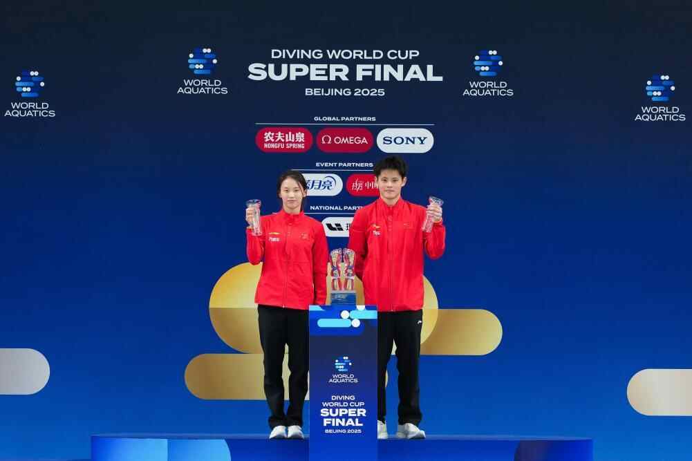 5月4日,朱子锋(右)和陈芋汐在颁奖仪式上。当日,2025年世界泳联跳水世界杯总决赛落幕。在赛后举行的2025年世界泳联跳水世界杯年度最佳运动员颁奖仪式上,中国运动员朱子锋、陈芋汐分获年度最佳男子、女子运动员称号。新华社发(那宇奇摄)