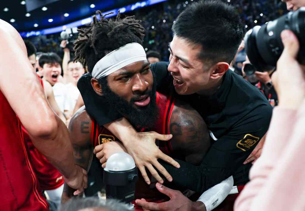 5月2日,北京北汽队球员杰曼(左)和队友方硕在比赛后庆祝。当日,在2024-2025赛季中国男子篮球职业联赛(CBA)季后赛半决赛第三场比赛中,北京北汽队主场121比103战胜山西汾酒队,总比分3比0晋级总决赛。新华社记者 雒圆 摄
