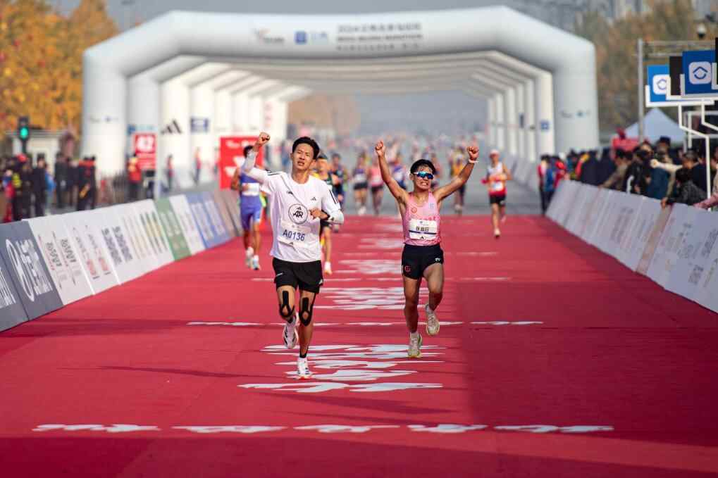 2024年11月3日,2024北京马拉松赛暨全国马拉松锦标赛(第3站)在京举行。参赛选手冲向位于奥林匹克公园的终点线。(新华社记者 陈钟昊摄)
