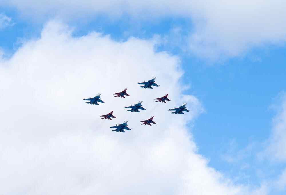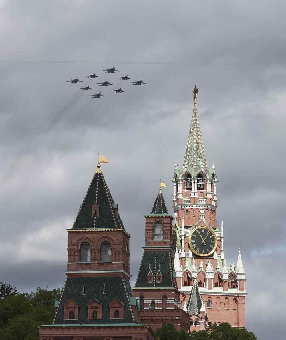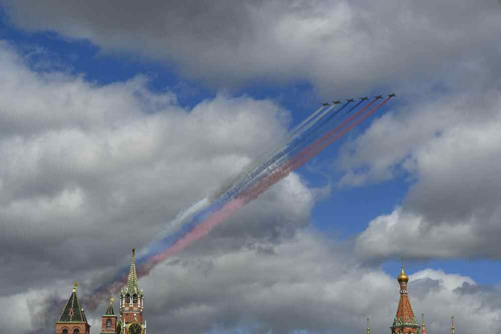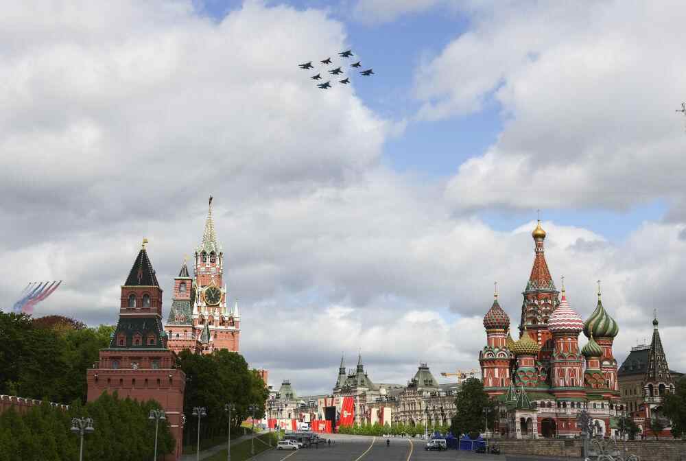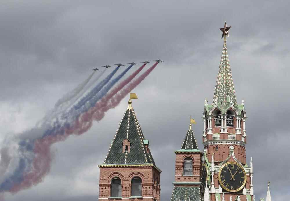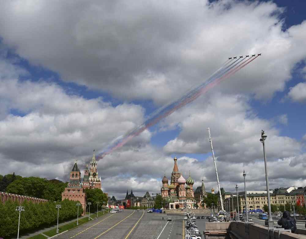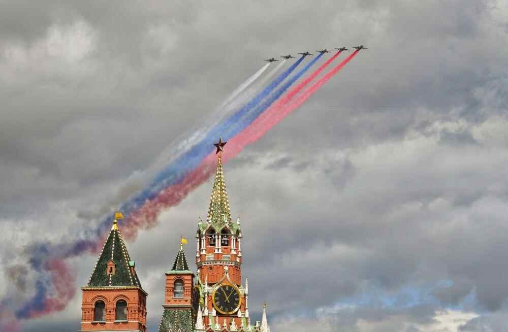 ↑5月5日,在俄罗斯首都莫斯科,战机编队飞过红场,参加苏联伟大卫国战争胜利80周年阅兵式彩排。新华社发(亚历山大摄)