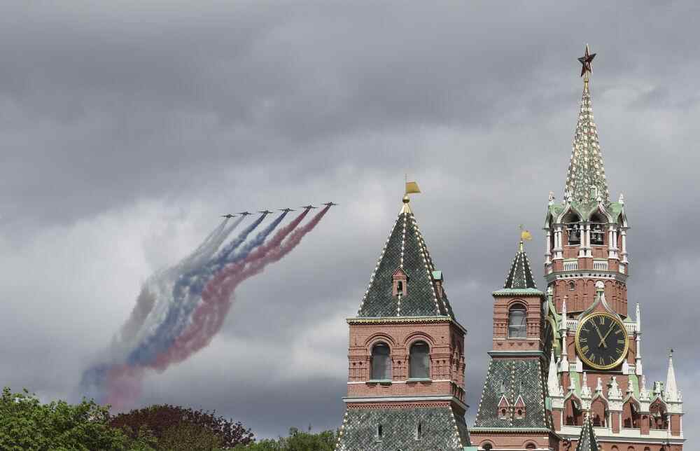 ↑5月5日,在俄罗斯首都莫斯科,战机编队飞过红场,参加苏联伟大卫国战争胜利80周年阅兵式彩排。新华社记者 姚大伟 摄