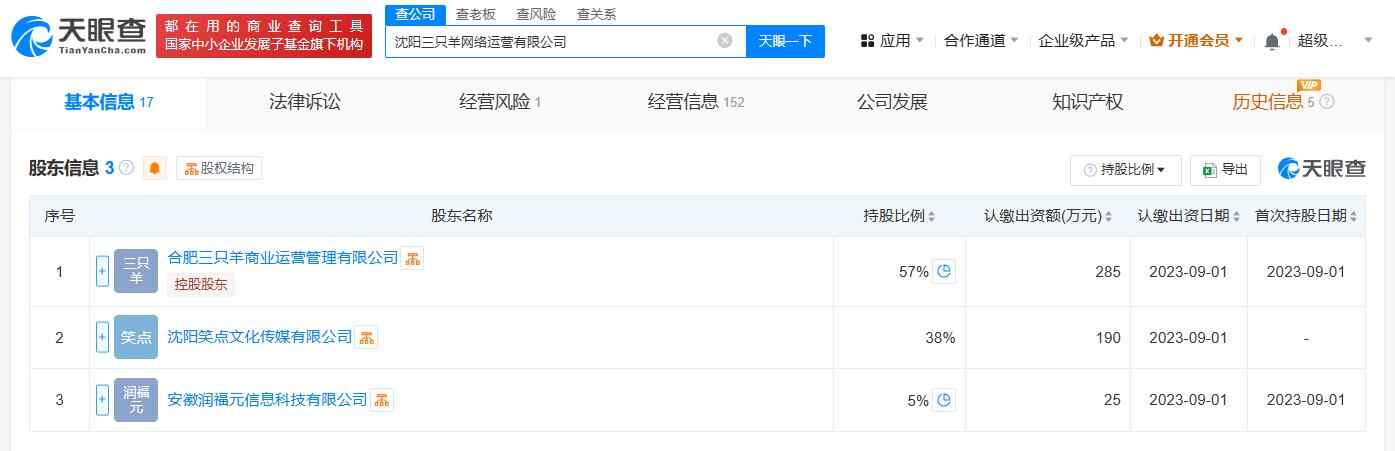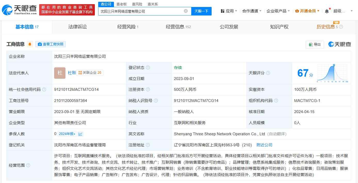 沈阳三只羊网络运营有限公司成立于2023年9月,法定代表人为杜刚,注册资本500万人民币,经营范围包括互联网直播技术服务、品牌管理、组织文化艺术交流活动、广告发布等。股东信息显示,该公司由合肥三只羊商业运营管理有限公司、沈阳笑点文化传媒有限公司、安徽润福元信息科技有限公司共同持股。