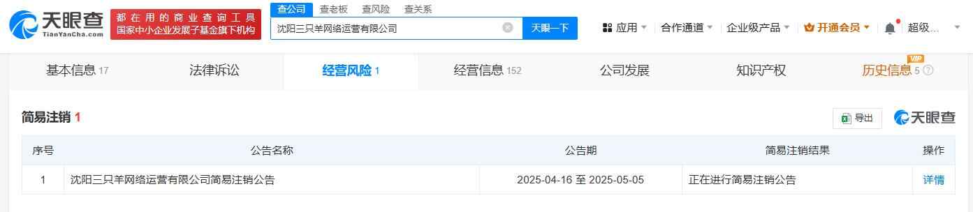 不过,据天眼查App最新消息显示,近日,沈阳三只羊网络运营有限公司新增一则简易注销公告,公告期为4月16日至5月5日。