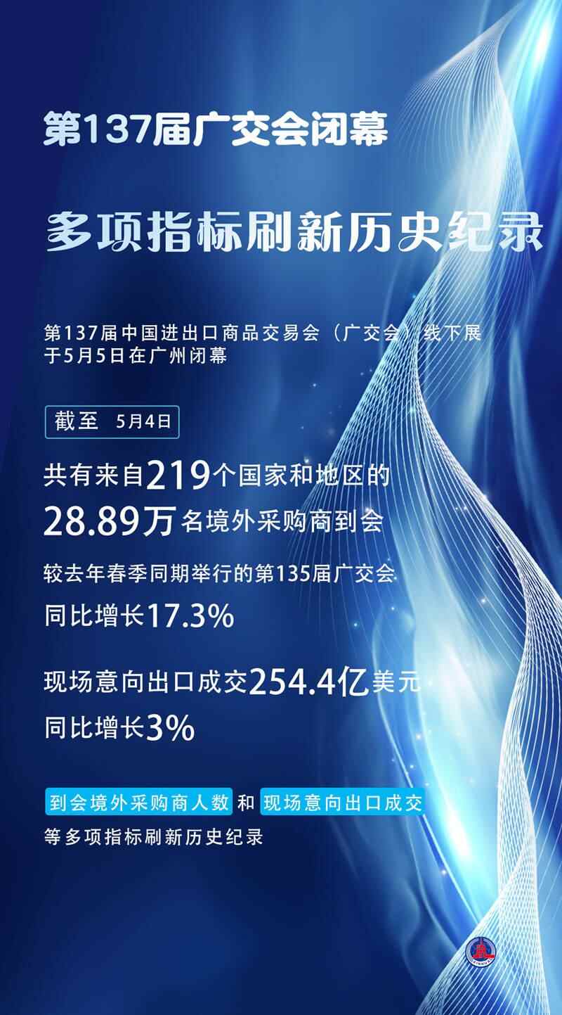 新华社广州5月5日电(记者丁乐、詹奕嘉)第137届中国进出口商品交易会(广交会)线下展于5月5日在广州闭幕,到会境外采购商人数和现场意向出口成交等多项指标刷新历史纪录。截至5月4日,共有来自219个国家和地区的28.89万名境外采购商到会,较去年春季同期举行的第135届广交会同比增长17.3%;现场意向出口成交254.4亿美元,同比增长3%。