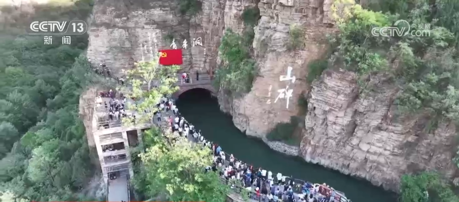 在河南林州市红旗渠景区,来自全国各地的旅游团、研学团队、自驾人群纷至沓来。游客们行走在不足两米宽的渠墙之上,抬头便是陡立的峭壁,俯首就是数丈高的悬崖。沿着渠岸一路行进,仰望巍峨耸立的太行山,目睹修建在悬崖峭壁间的红旗渠。
