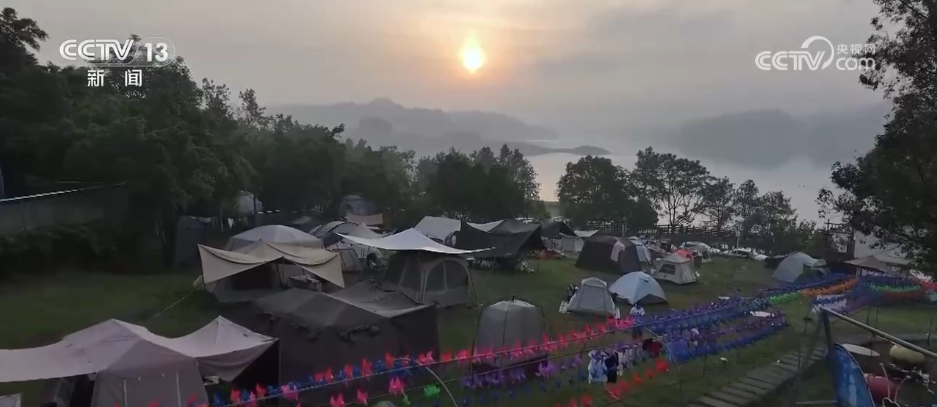 在重庆长寿湖旅游景区的露营基地,数百顶帐篷分布在长寿湖畔的草坪上,三五好友或家庭齐聚一堂,大家可以参加到游乐项目中,也能聚在一起聊天、喝茶、吃美食。