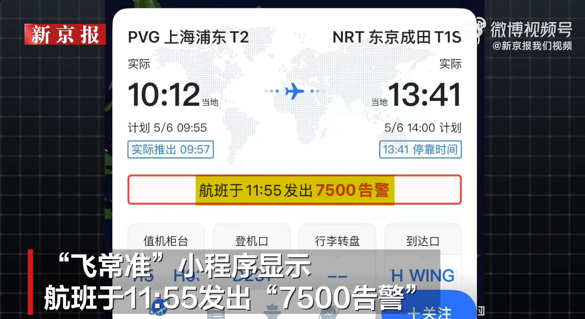 5月6日,网民反映“飞常准”小程序警告称,国航CA929航班发出“7500告警”。公开资料显示“7500”应答机代码代表非法干扰,及飞机遭遇劫机或面临劫机危险。