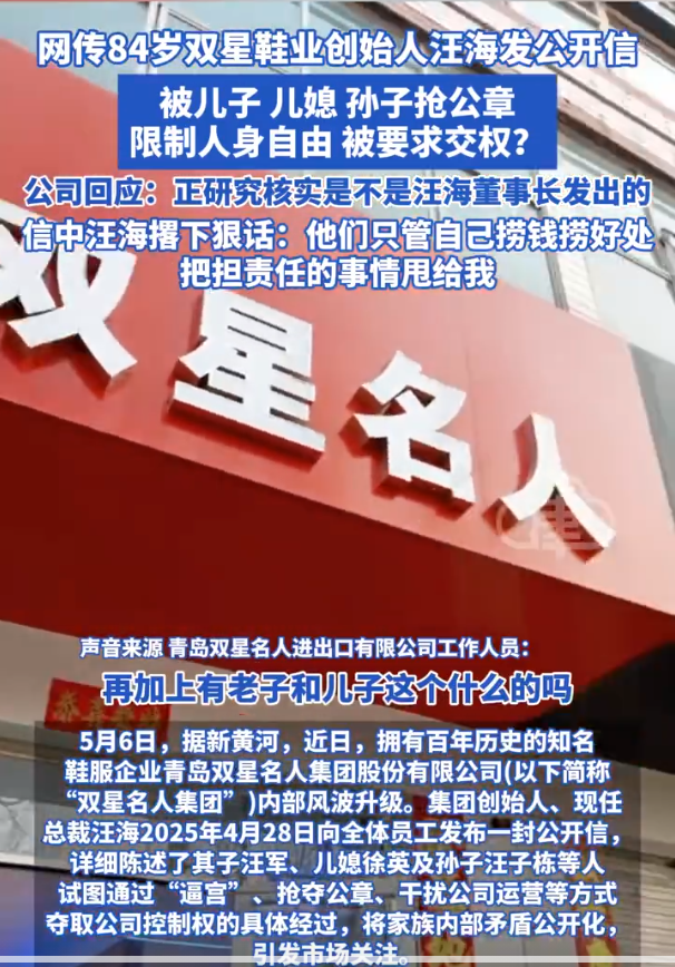 近日,一封疑似由双星创始人、青岛双星名人集团股份有限公司(以下简称“双星名人”或“双星鞋业”)总裁汪海给全体双星鞋服员工的一封公开信在网络上流传,信中称汪海被儿子、儿媳、孙子抢公章、限制人身自由,被要求交权。