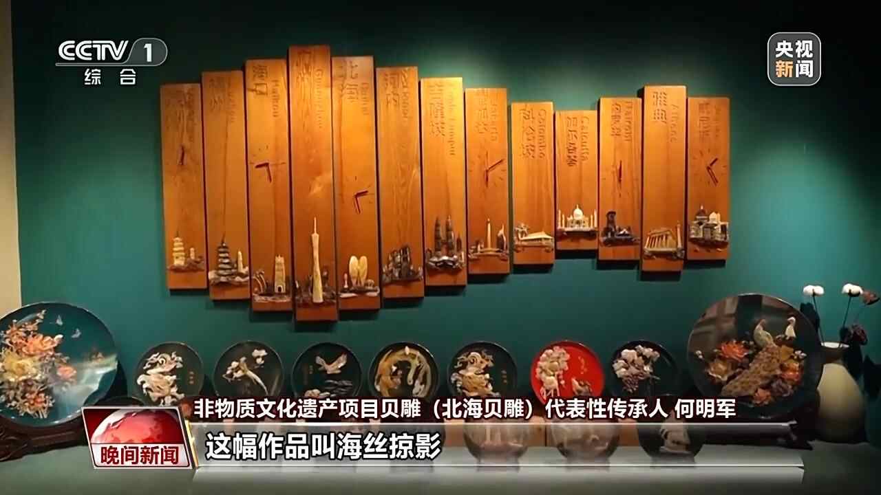 非物质文化遗产项目贝雕(北海贝雕)代表性传承人 何明军:这幅作品叫海丝掠影,总共有13块国家的城市地标剪影组成。从我们北海出去的话,经过了东南亚到非洲,最后到了威尼斯,这个作品我们用贝雕的形式来呈现的话,还是第一次。