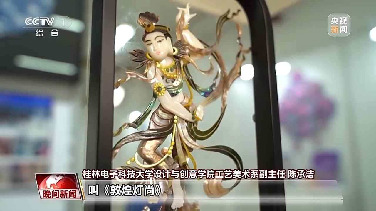 桂林电子科技大学设计与创意学院工艺美术系副主任 陈承洁:这一组作品的话,就是我们老师跟同学一起合作的作品叫《敦煌灯尚》,这个作品的话是获得了我们2019年首届中国工艺美术博览会“云鼎杯”的文创设计大赛的金奖。同时我们再看一下这边的作品,我们同学用非遗绒花跟非遗贝雕进行了一个融合的创新,以及我们后面的这一幅装饰画,它是用了蜡染加贝雕相结合的方式进行了材质的创新。