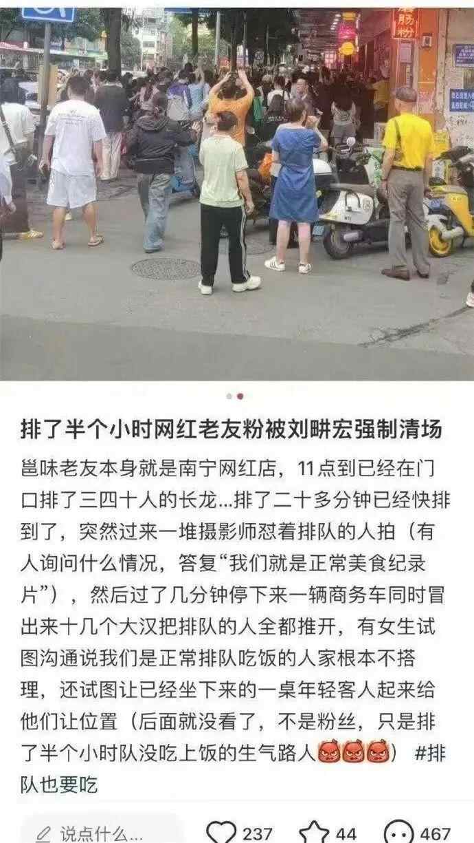 近日,有网友在社交媒体上发文称,自己在一网红米粉店排队半个小时却被刘畊宏团队强制清场。