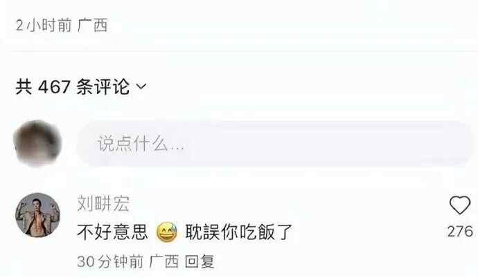 随后,刘畊宏在其评论区回复:“不好意思,打扰你吃饭了。”有网友认为刘畊宏使用的表情包带有嘲讽意味。5月6日,话题#刘畊宏 清场#登上微博热搜榜单。