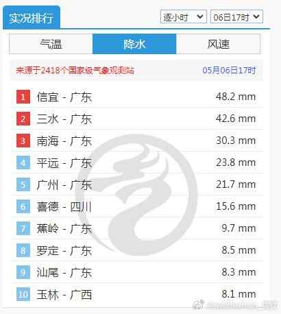 昨天(5月6日)中午时段,雷雨在广东“散花式”铺开,还有强对流云团冒出并东移。当天17时的全国降水实况排行榜中,广东8地挤进了前十。