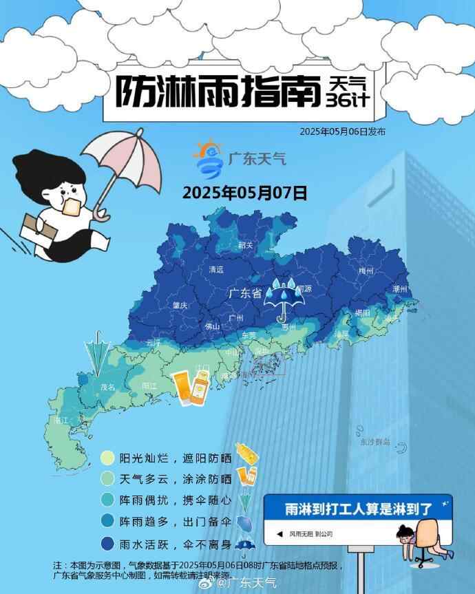 @广东天气 预计,7-8日,大部分市县有雷阵雨,中北部市县局部有大雨或暴雨;9-10日,受高空槽、切变线和弱冷空气共同影响,广东中北部市县有大雨到暴雨,局部大暴雨,其余市县有中雷雨局部暴雨,伴有短时强降水、8级左右短时大风等强对流天气。