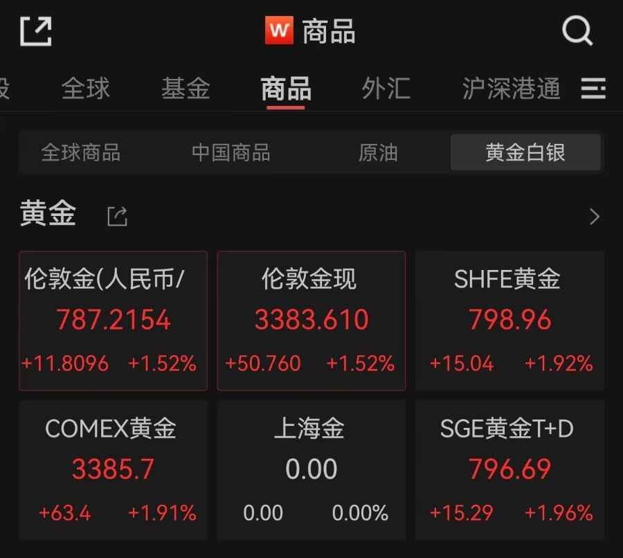 Wind数据显示,截至10时左右,现货黄金报3383.61美元/盎司。COMEX黄金期货涨近2%,报3385.70美元/盎司。此外,沪金主力涨近2%,最新报798.96元/克。