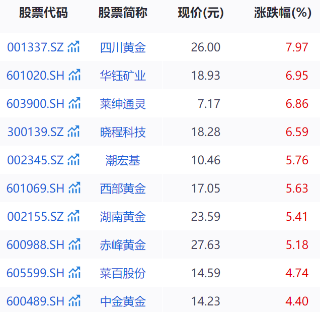 受此影响,今日A股市场黄金概念股集体上扬,四川黄金(001337.SZ)、西部黄金(601069.SH)、湖南黄金(002155.SZ)等涨超5%,多股跟涨。