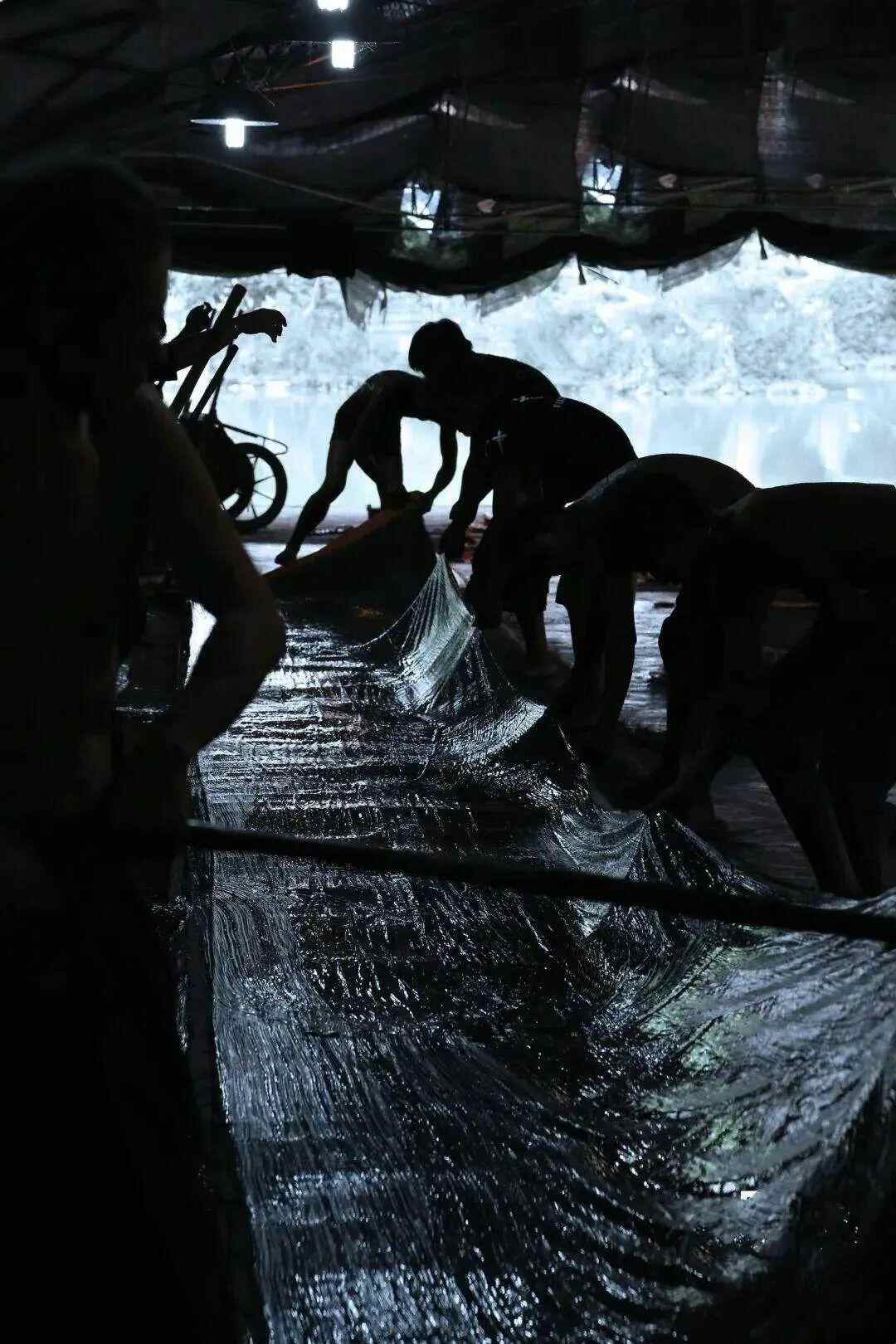 未经阳光照射,黑色就不会渗透到另一面,因此匠人们要在日出前完成香云纱“过乌”。受访者供图