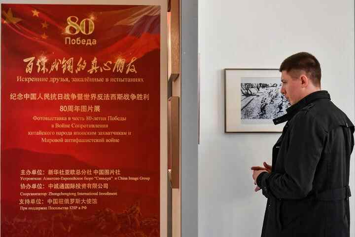 2025年4月18日,在俄罗斯首都莫斯科,嘉宾参观纪念中国人民抗日战争暨世界反法西斯战争胜利80周年图片展。当日,“百炼成钢的真心朋友”——纪念中国人民抗日战争暨世界反法西斯战争胜利80周年图片展在中国驻俄罗斯大使馆举行。新华社记者 曹阳 摄