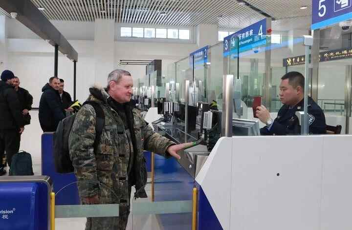 2024年12月10日,在黑河公路口岸旅检大厅,黑河出入境边防检查站民警为首班次客车入境旅客办理边检通关手续。当日,中国黑河公路口岸—俄罗斯卡尼库尔干公路口岸旅客运输正式开通。新华社发(刘松摄)