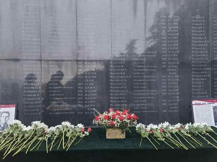 在南京抗日航空烈士纪念馆镌刻有苏联籍抗日航空英烈名录的纪念碑前,摆放着人们献上的鲜花(2024年11月22日摄)。新华社记者 邱冰清 摄