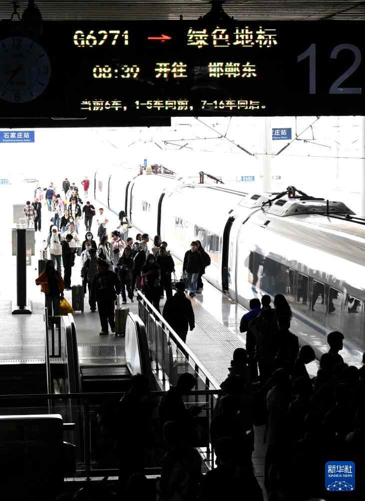 5月4日,旅客在河北石家庄火车站站台准备乘车。