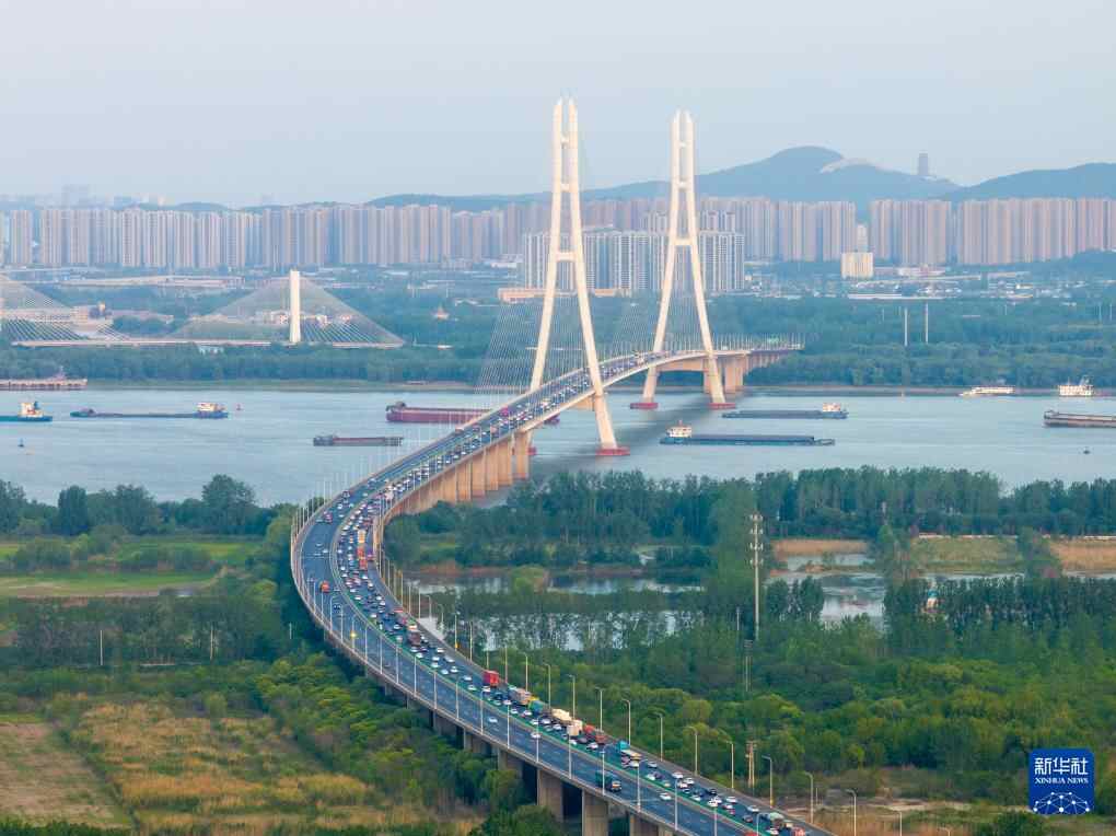 这是5月4日拍摄的南京大胜关长江大桥上的车流(无人机照片)。