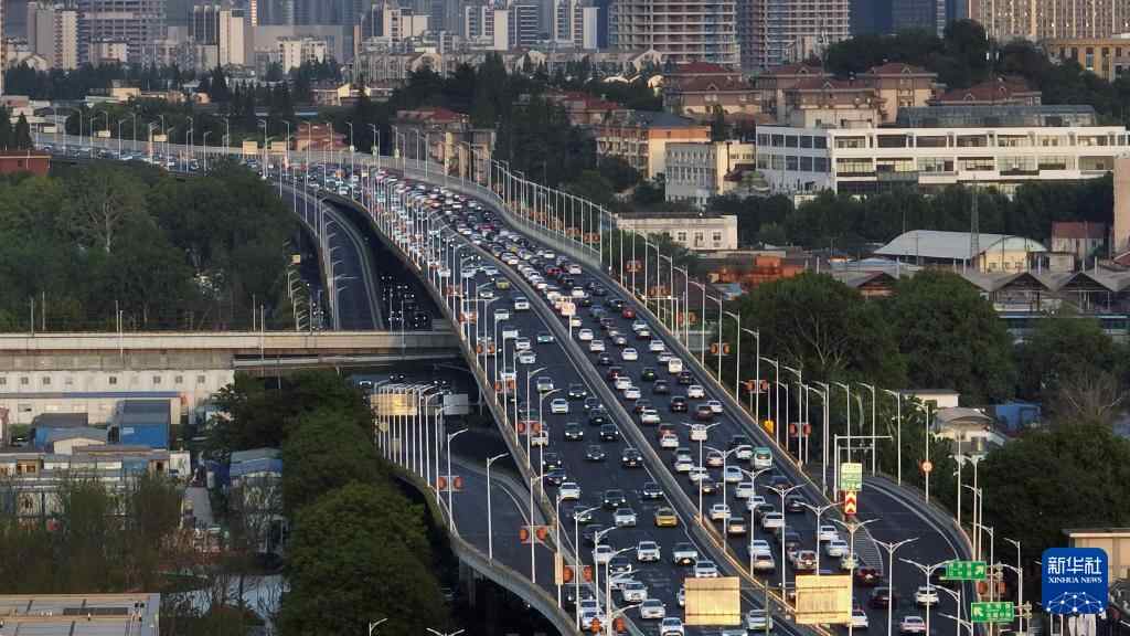 5月4日拍摄的南京应天大街高架桥上的车流(无人机照片)。