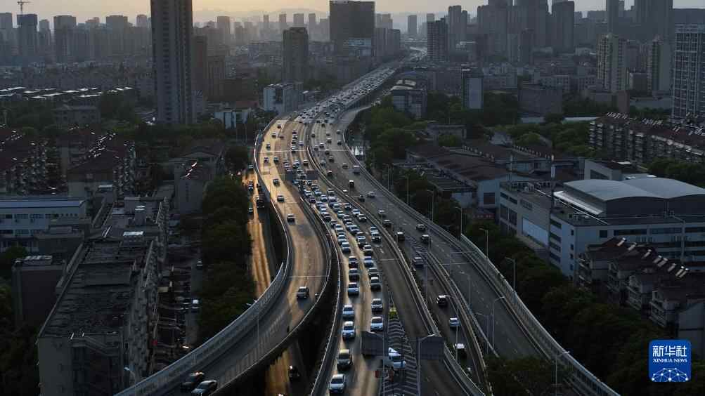 5月4日傍晚拍摄的南京应天大街高架桥上的车流(无人机照片)。