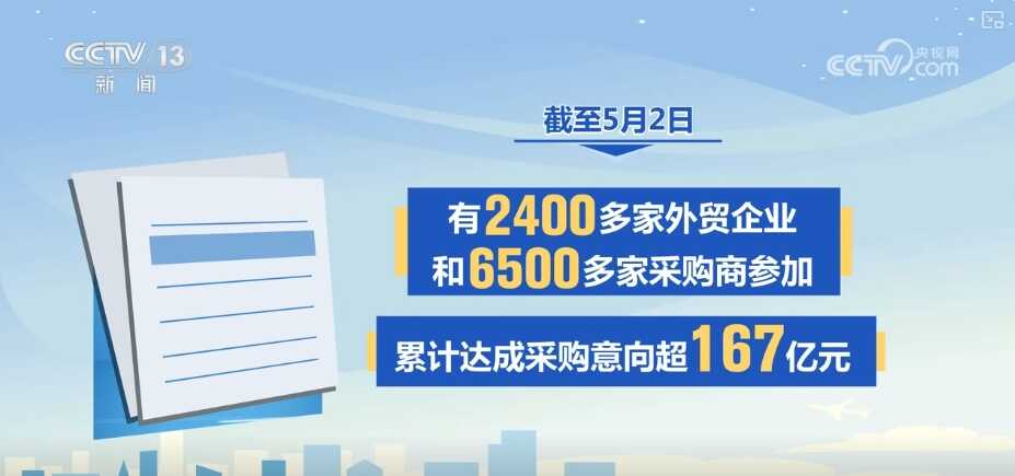 商务部数据显示,截至5月2日,上海、四川、江苏等10个重点地区先后举办“外贸优品中华行”等产销对接活动,有2400多家外贸企业和6500多家采购商参加,累计达成采购意向超167亿元。