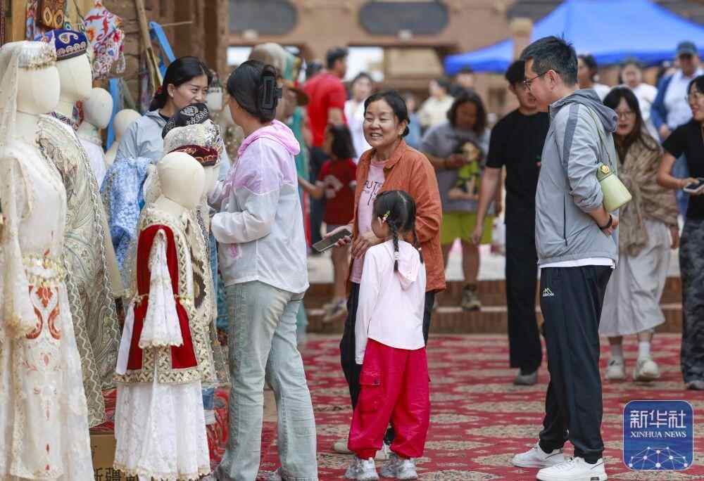 ↑ 5月4日,游客在新疆吐鲁番市鄯善县吐峪沟景区欣赏民族歌舞表演。