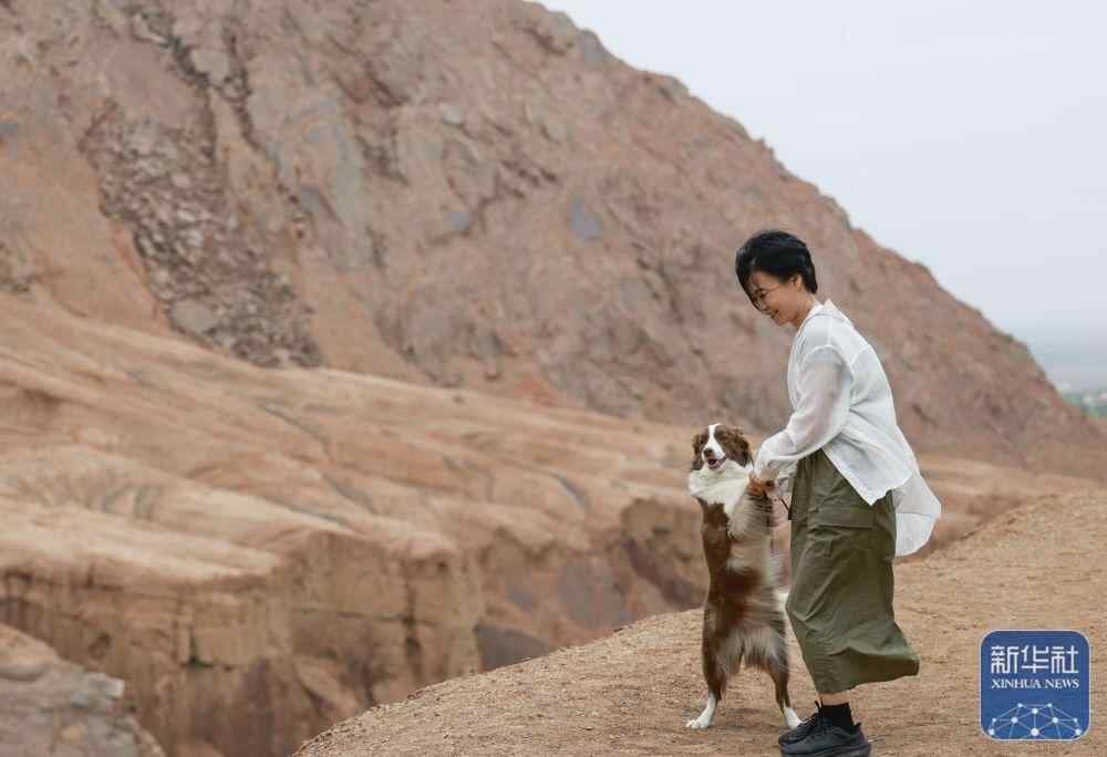↑ 5月4日,一名携带宠物的游客在位于新疆吐鲁番市鄯善县的吐峪沟大峡谷游玩。