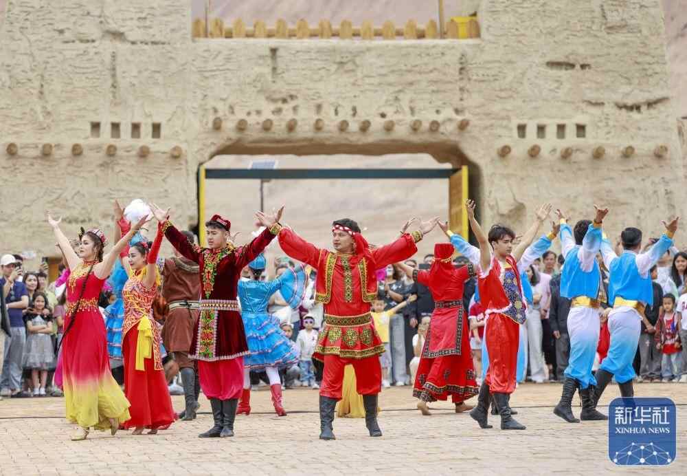 ↑ 5月4日,演员在新疆吐鲁番市鄯善县吐峪沟景区表演民族歌舞。