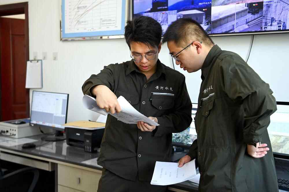 4月28日,龙门水文站职工甘源(左)与霍鸣冲在核对水文数据。新华社记者 邹竞一 摄