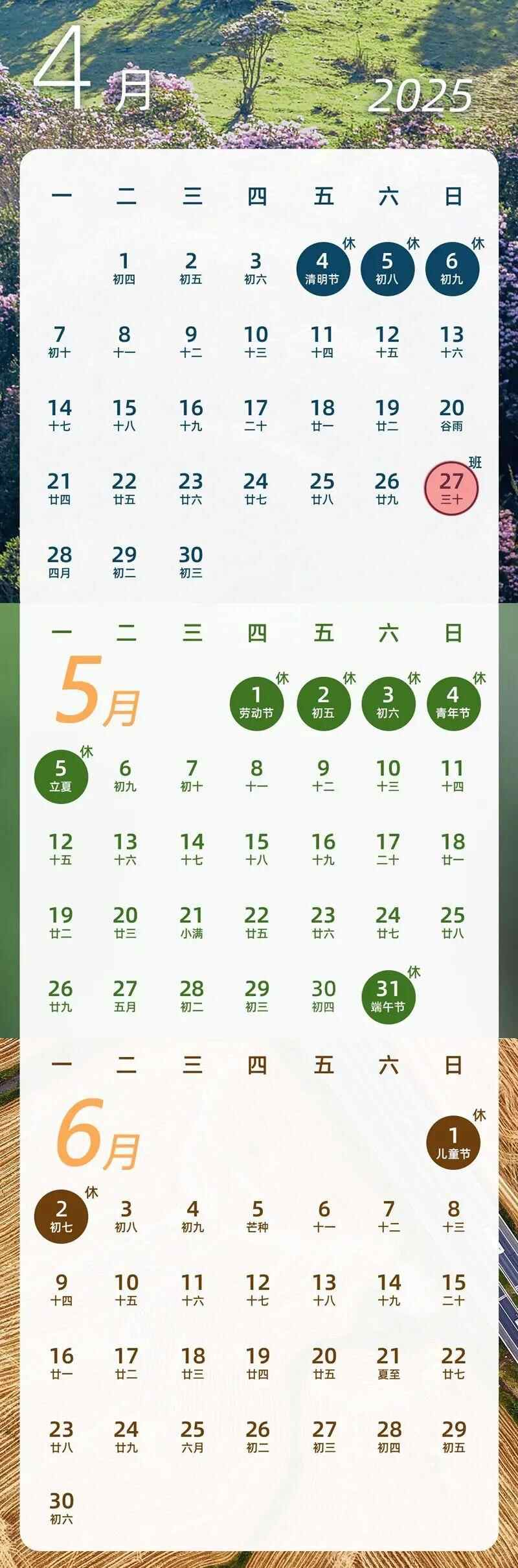 端午假期后,下次放假为国庆节+中秋节,10月1日至10月8日放假,共8天。
