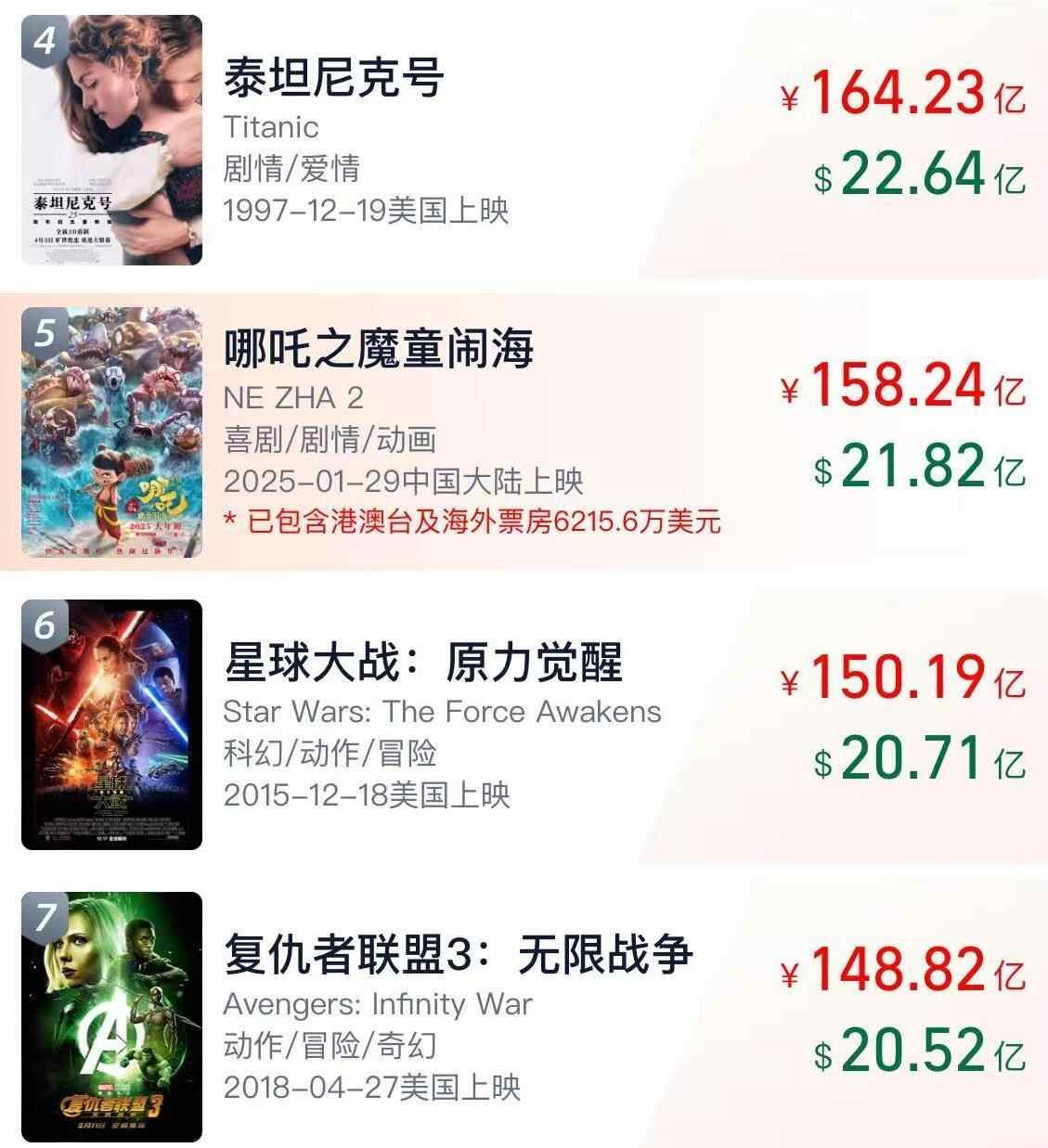 据网络平台数据,截至5月5日,电影《哪吒之魔童闹海》总票房(包含港澳台和海外票房)已突破158亿,排名全球影史票房第5,即将超越《泰坦尼克号》。