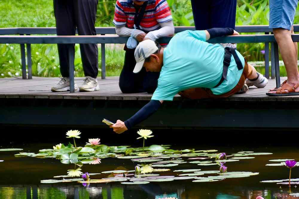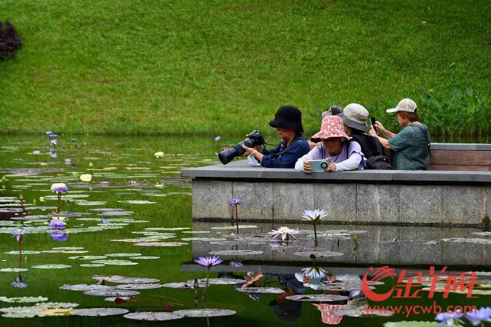 在莲香池畔,记者遇到了正在调整相机构图的摄影爱好者吴阿姨,她告诉记者,不少市民朋友早在8时前后便赶来等待双色睡莲的绽放。“昨晚刷到公众号推送,今天就赶紧来了。”