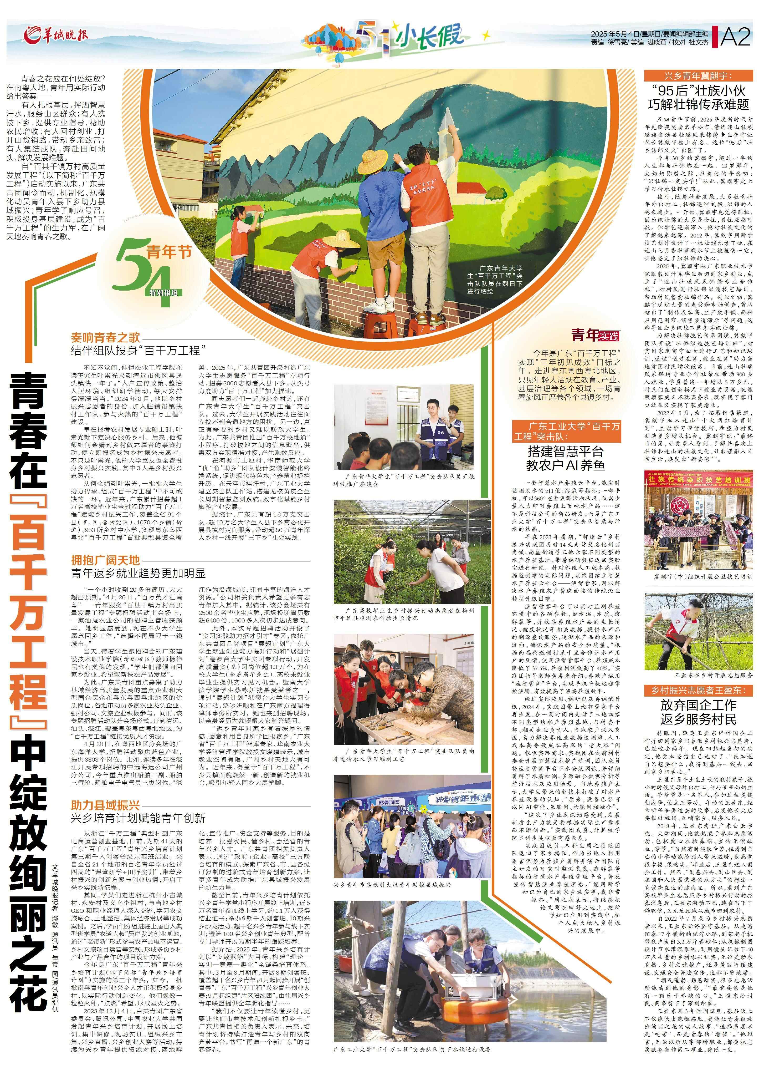 自“百县千镇万村高质量发展工程”(以下简称“百千万工程”)启动实施以来,广东共青团闻令而动,机制化、规模化动员青年入县下乡助力县域振兴;青年学子响应号召,积极投身基层建设,成为“百千万工程”的生力军,在广阔天地奏响青春之歌。