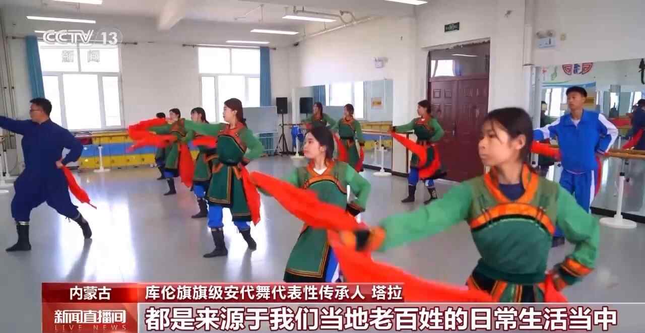 库伦旗旗级安代舞代表性传承人 塔拉:安代舞有很多动作都是来源于我们当地老百姓的日常生活,比如说在草原上套马的动作,就是现在的绕巾、甩过去这个动作;还有在田间干活,刨地这个动作,形成了现在跺踏甩巾的动作。