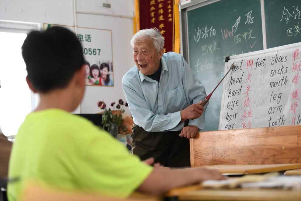 安徽马鞍山卜陈村的午后,阳光和煦。三尺旧讲台上,97岁的叶连平正在给学生们上课。