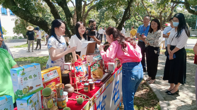 乡村振兴行动志愿者张钧如在CCTV-17“乡村助农团”17助农日系列活动广东站为茂南展馆讲解,接受中央电视台记者访问,为茂南推介“荔枝鸡”农产品